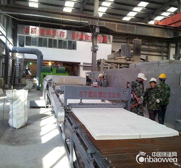 生产设备:“多机联体”一次成型硅酸铝板流水线。在硅酸铝棉喷吹时加入一定比例的粘结剂,形成硅酸铝毡坯通过固化室热风穿透定型后,电脑控制台自动切割成型的硅酸铝干法板。